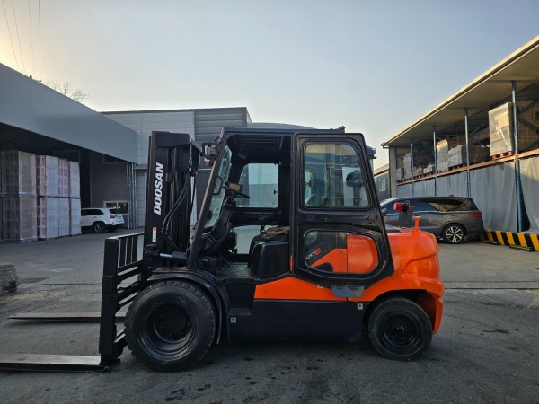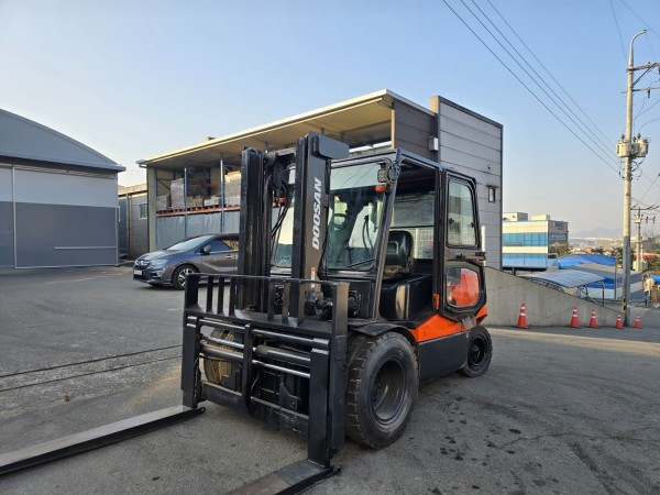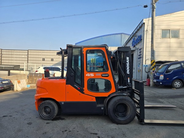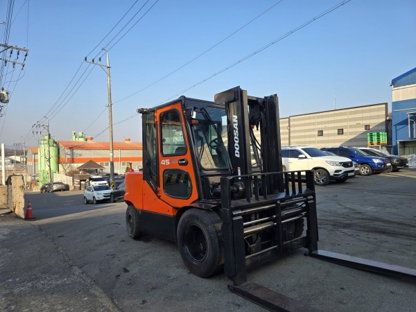 두산 4.5톤 디젤지게차 풀옵션! 캐빈+자동발+더블타이어