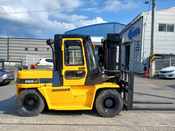 두산의 대표 모델 D50S-2 노랭이는 내구성과 출력이 우수해 공장·물류창고·야적장 등 다양한 현장에서 검증된 장비입니다.