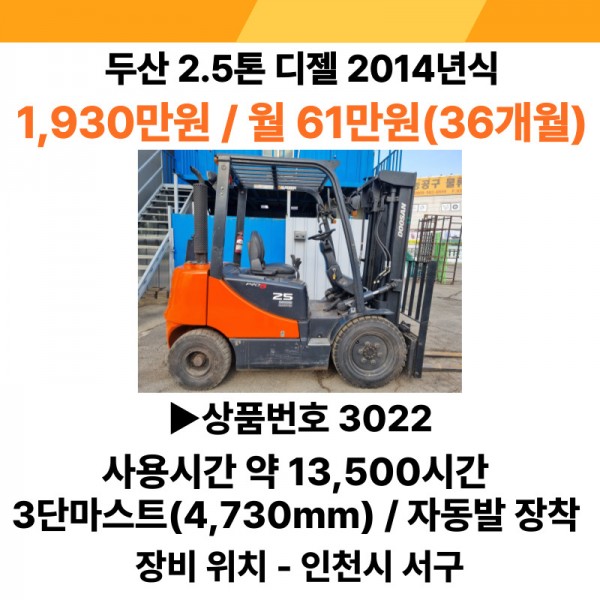 인천 중고지게차 두산 2.5톤 디젤 D25SE-5 (2014년식)