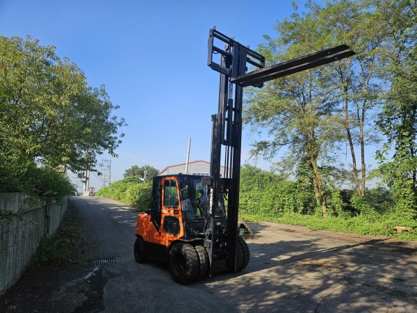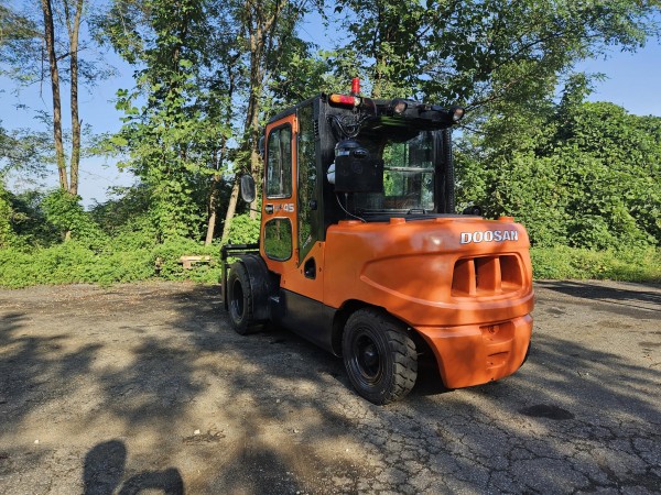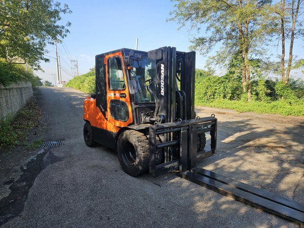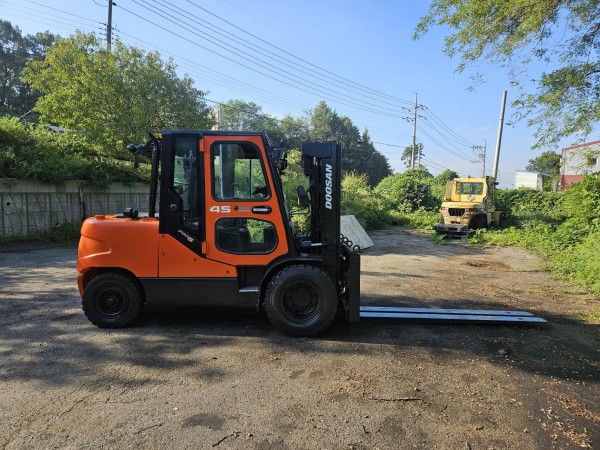 [중고지게차] 두산 D45S-5 4.5톤 3단 디젤지게차(자동발, 더블타이어, 냉난방•후방, 안전경보기, 덧발) 판매 | 한결지게차