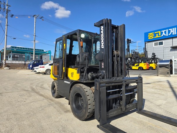 중고지게차 A급 두산 4.5톤 3단마스트 캐빈 자동발 디젤지게차