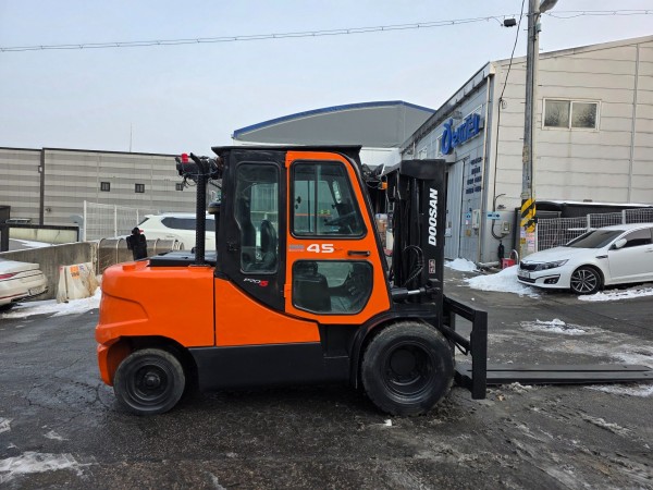 중고지게차 A급 두산 4.5톤 3단마스트 캐빈 자동발 디젤지게차