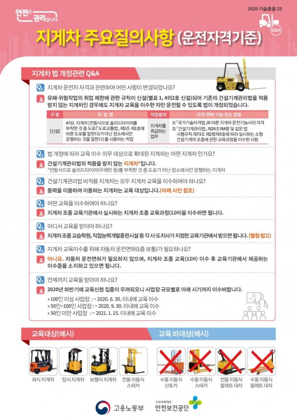 2020년에 법이 개정되면서 동력을 이용하여 이동하는 지게차는 모두 의무적으로 교육을 받아야 합니다.